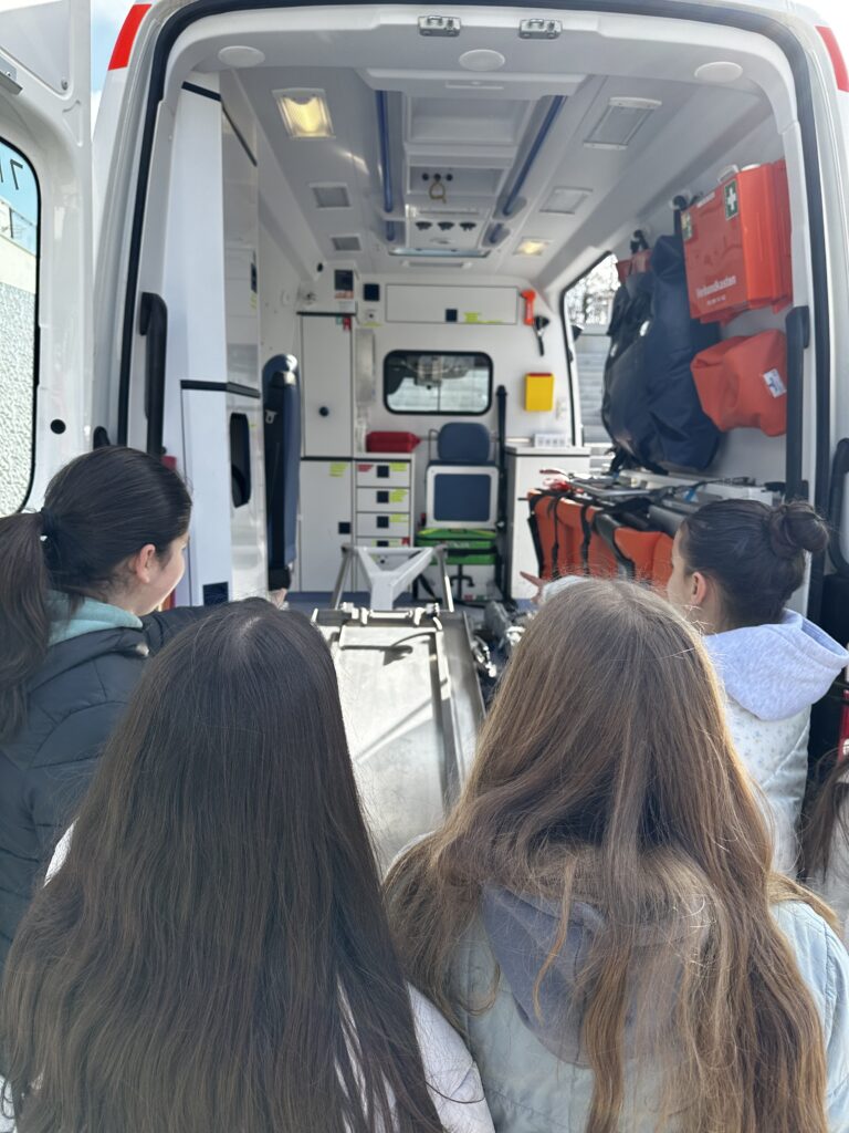 In diesem Jahr war der Malteser Hilfsdienst zu Gast am Elly. Die Schüler*innen erhielten so einen direkten Einblick in die Arbeit von Rettungskräften. Ein besonderes Highlight war das mitgebrachte Rettungsfahrzeug, das vor Ort besichtigt werden konnte. Auch der angebotene Workshop zum Handeln in Krisensituationen wurde interessiert verfolgt und es wurden zahlreiche Fragen beantwortet!