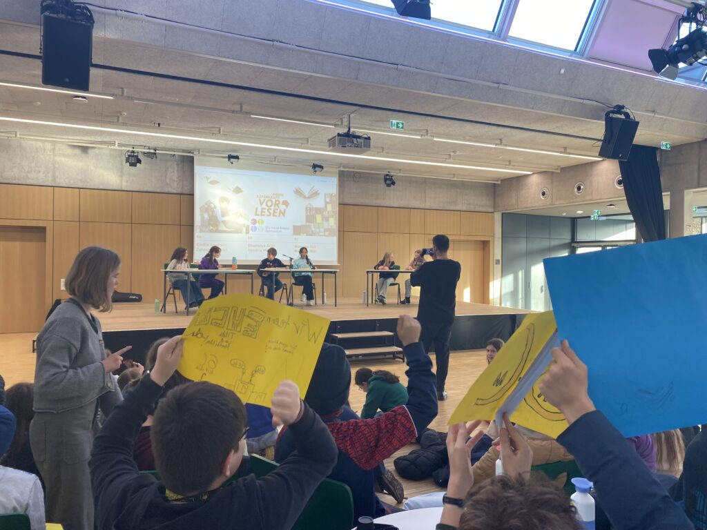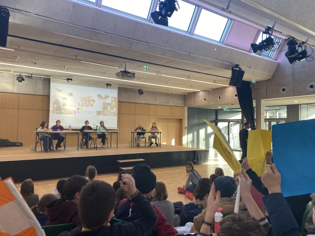 Erstmals fand der Vorlesewettbewerb der sechsten Klassen auf der Bühne des neuen Forums statt – was für eine Kulisse! Das Publikum, bestehend aus allen Fünft- und Sechstklässlerinnen, feuerte die sechs Vorleser*innen kräftig an. Vielleicht lag es daran – vielleicht aber auch an der entspannten und wertschätzenden Moderation des Organisators Herrn Kiridis –, dass den Kandidat*innen aus der 6a, 6b und 6c keinerlei Aufregung anzumerken war.
